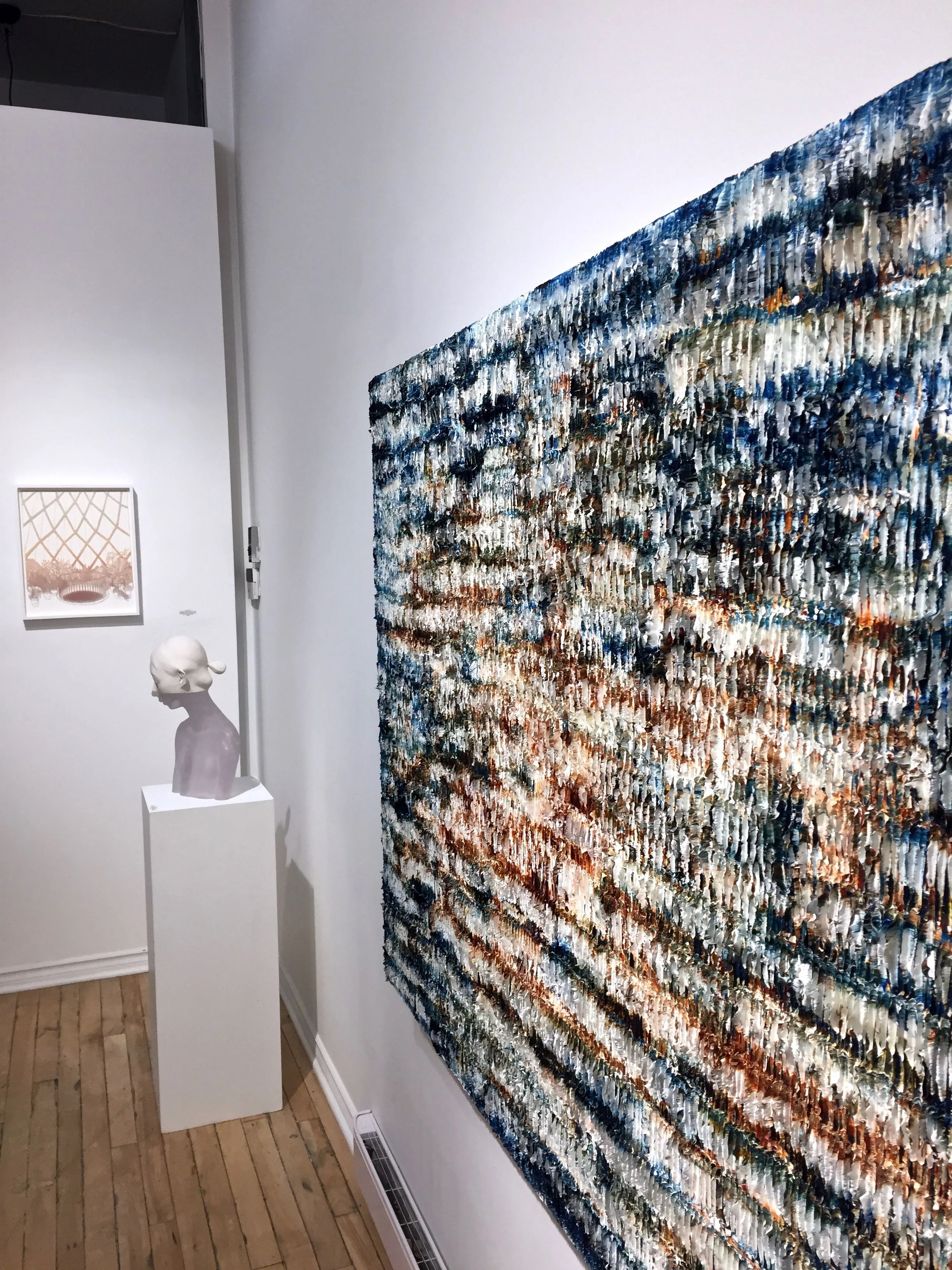 Le tableau Sandbanks aux cotés d'un buste par Gosia (centre) et d'une lithographie d'Annyen Lam (gauche)